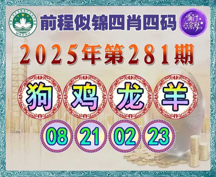 281期: 🥽《前程似锦》 🥽四肖四码🥽【狗鸡龙羊】【08.21.02.23】开:羊47准