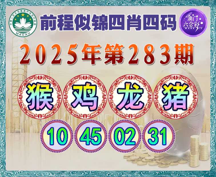 283期: 🥽《前程似锦》 🥽四肖四码🥽【猴鸡龙猪】【10.45.02.31】开:鸡45准