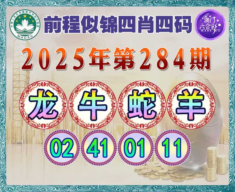 284期: 🥽《前程似锦》 🥽四肖四码🥽【龙牛蛇羊】【02.41.01.11】开:牛41准