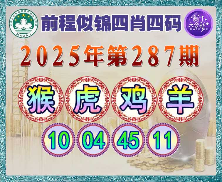 287期: 🥽《前程似锦》 🥽四肖四码🥽【猴虎鸡羊】【10.04.45.11】开:猴34准