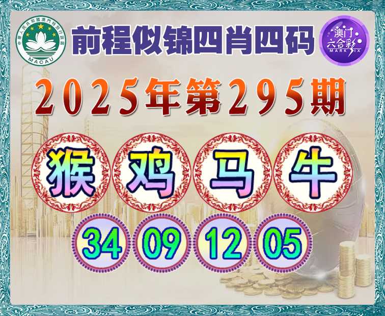 295期: 🥽《前程似锦》 🥽四肖四码🥽【猴鸡马牛】【34.09.12.05】开:牛05准