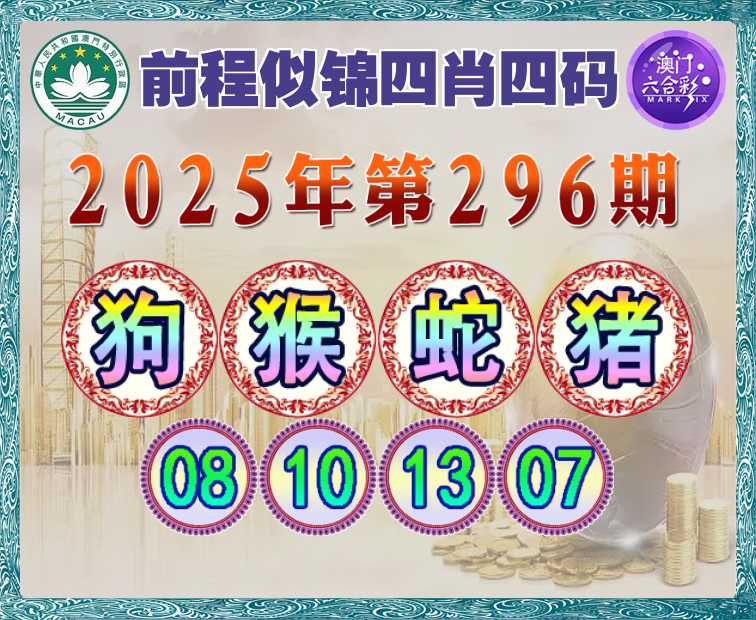 296期: 🥽《前程似锦》 🥽四肖四码🥽【狗猴蛇猪】【08.10.13.07】开:猴22准