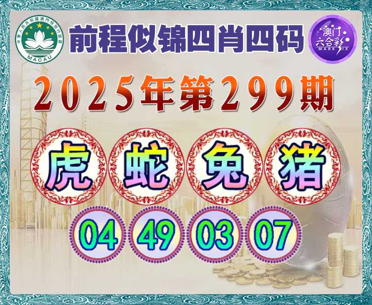 299期: 🥽《前程似锦》 🥽四肖四码🥽【虎蛇兔猪】【04.49.03.07】开:蛇49准