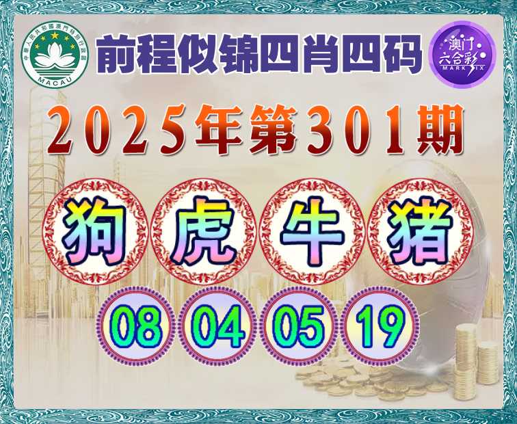 301期: 🥽《前程似锦》 🥽四肖四码🥽【狗虎牛猪】【08.04.05.19】开:牛05准