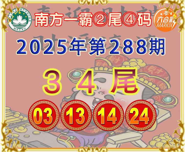 288期: 南方一霸 ✨②尾④码✨【34尾主:03.13.14.24】开:14准