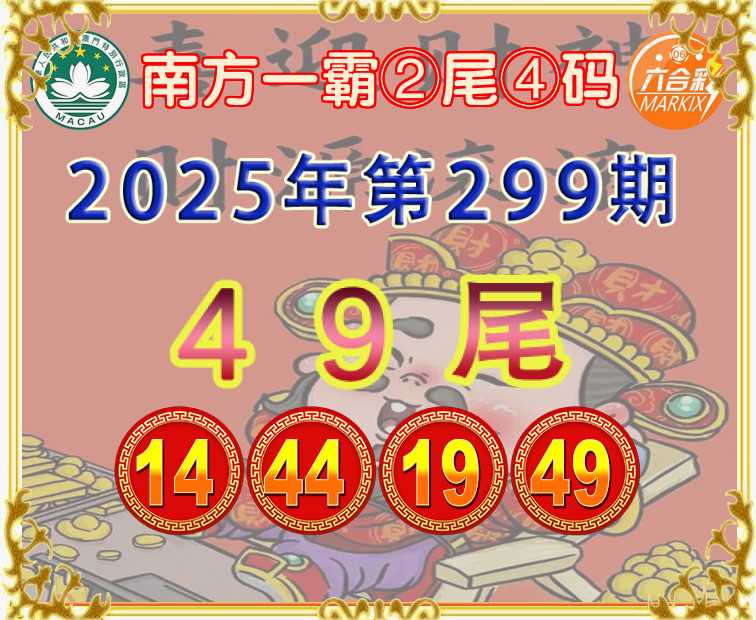 299期: 南方一霸 ✨②尾④码✨【49尾主:14.44.19.49】开:49准