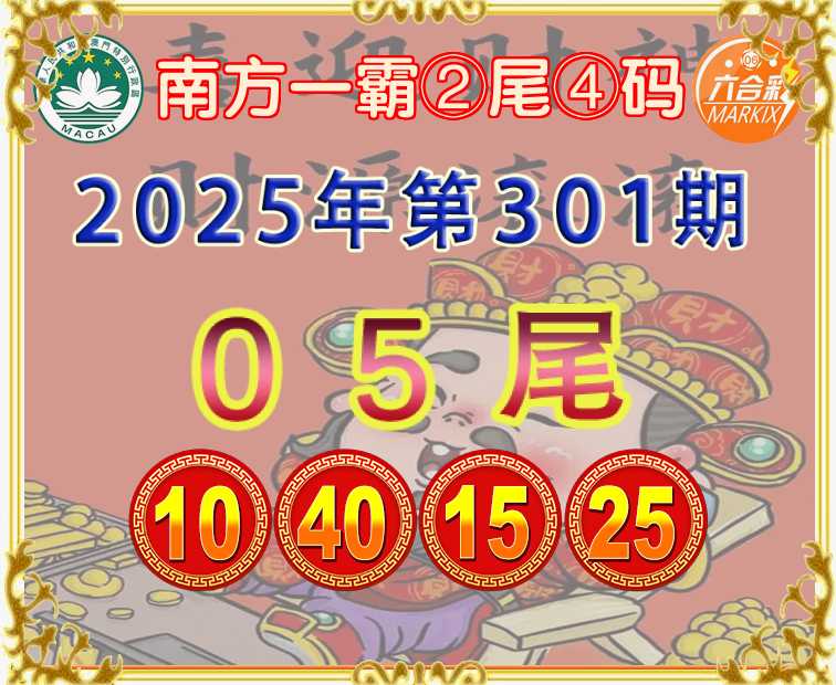 301期: 南方一霸 ✨②尾④码✨【05尾主:10.40.15.25】开:05准